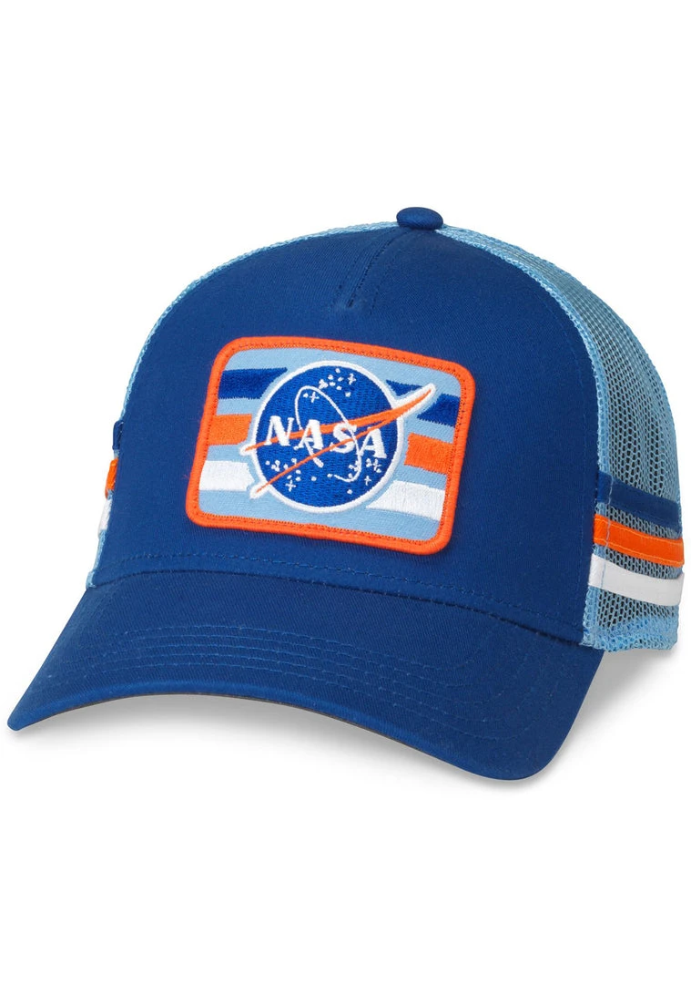 Show your love for the galaxy with the NASA Triangle Color Hat from American Needle. This totally stellar festival accessory features a blue cap and bill, mesh side and back paneling, striping detail on the mesh, adjustable plastic back strap, and embroidered NASA patch logo.
