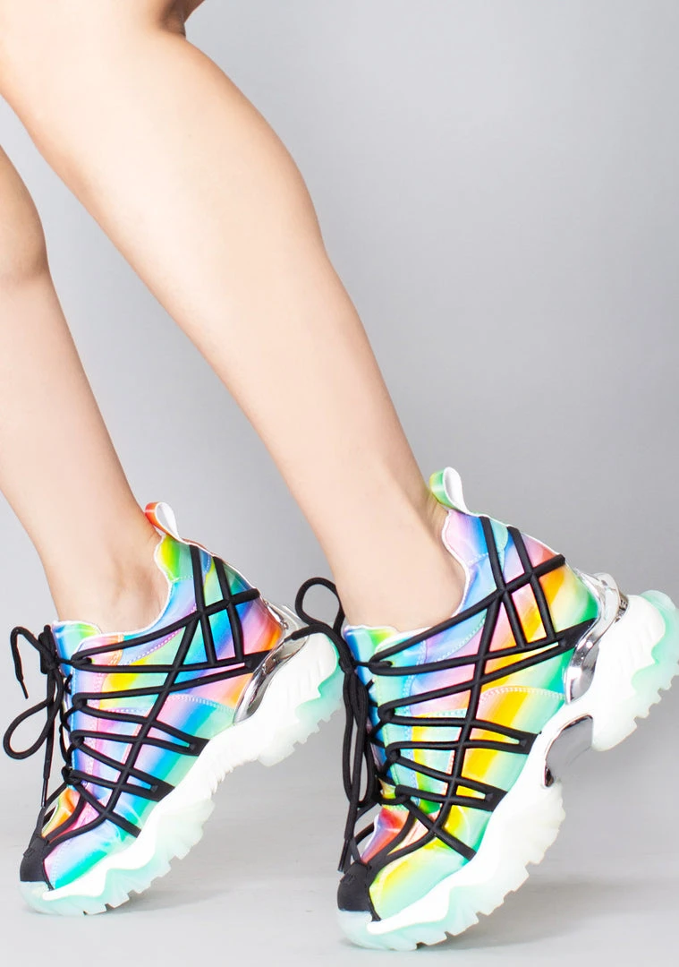 With the Bonus Round Platform Sneakers from Anthony Wang, your moves will get all the XP. These super festival platform sneakers feature a lenticular rainbow upper with black piping details, a lace-up front, silver accents on the sole, and hidden interior wedge heels that will level you up. With these cute sneakers, you will be a total K.O.!