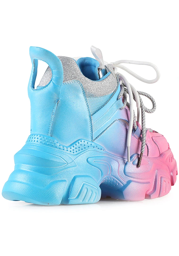 Nothing’s bringing you down when partying in these Anthony Wang High On Life Platform Sneakers. These chill festival platform sneakers feature a two-toned blue and pink hand-sprayed paint over vegan leather, mesh fabric upper, and platform sole. It’s designed with contrast sparkly trimmings, metallic silver lace-up front, and a built-in inner wedge for a hidden boost. So tell those Derek downers to get out of here with their negativity! Good vibes only!