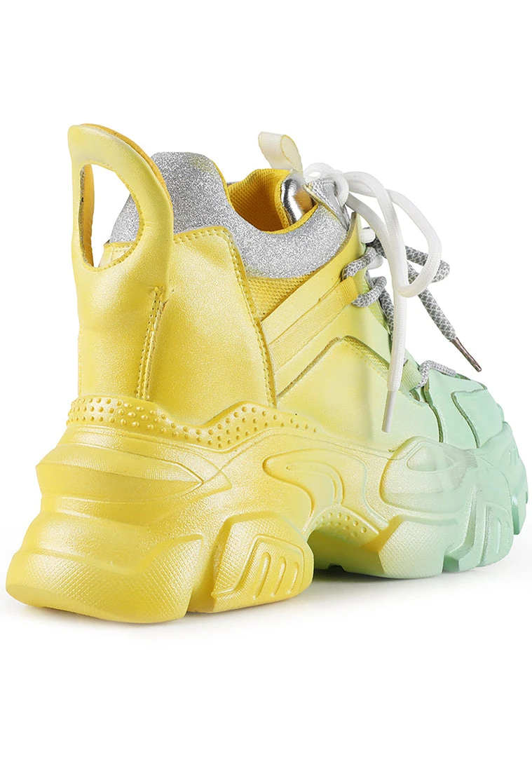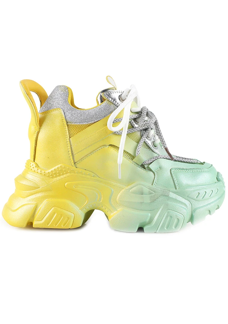 Go and show em’ what you’re about when dancing in these Anthony Wang That’s My Jam Platform Sneakers. These trending festival platform sneakers feature a green and yellow hand-sprayed paint over vegan leather, mesh fabric upper, and platform sole. It’s designed with contrast sparkly trimmings, metallic silver lace-up front, and a built-in inner wedge for a hidden boost. #Trendsetter