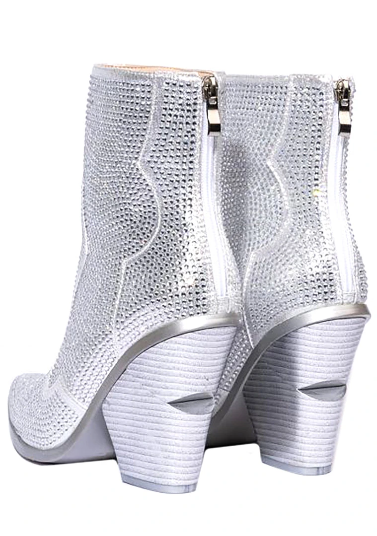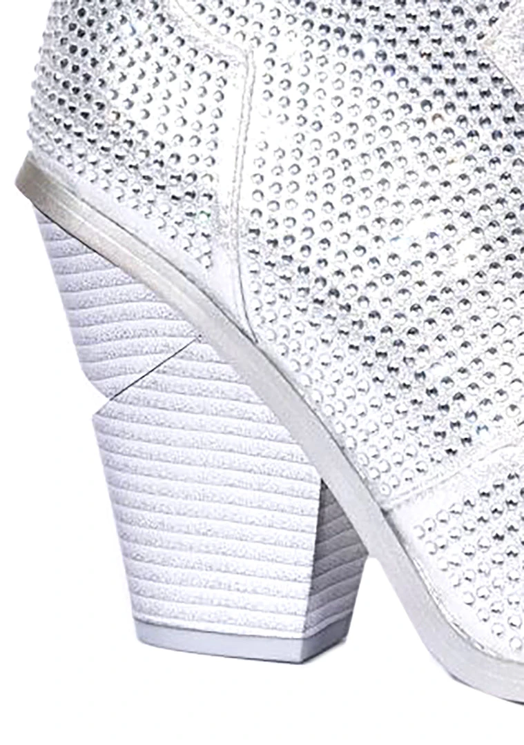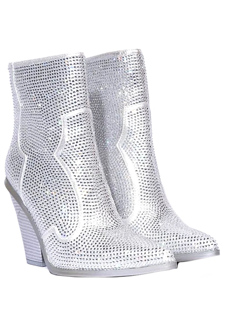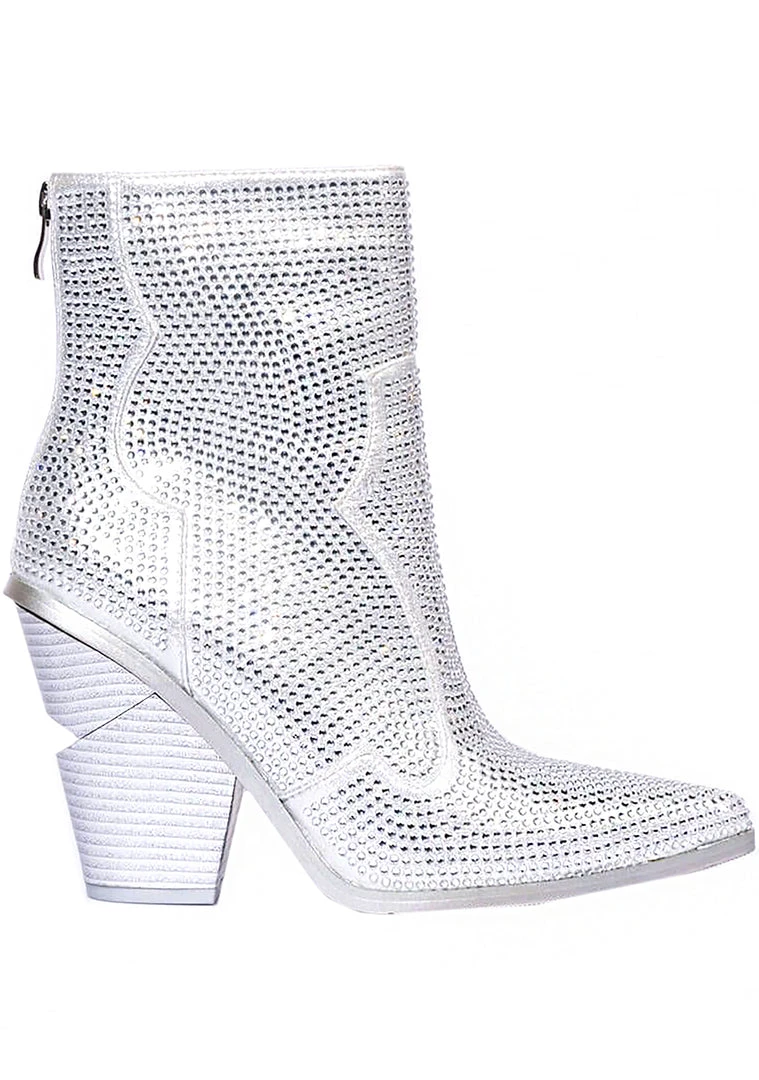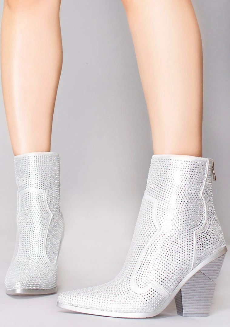 Show them your moves in the Stars Collide Rhinestone Boots from Azalea Wang. These cute festival boots feature a silver vegan leather upper encrusted with rhinestones, notch heel detail and zipper closure up the pack. Slip on these cute boots and dance.