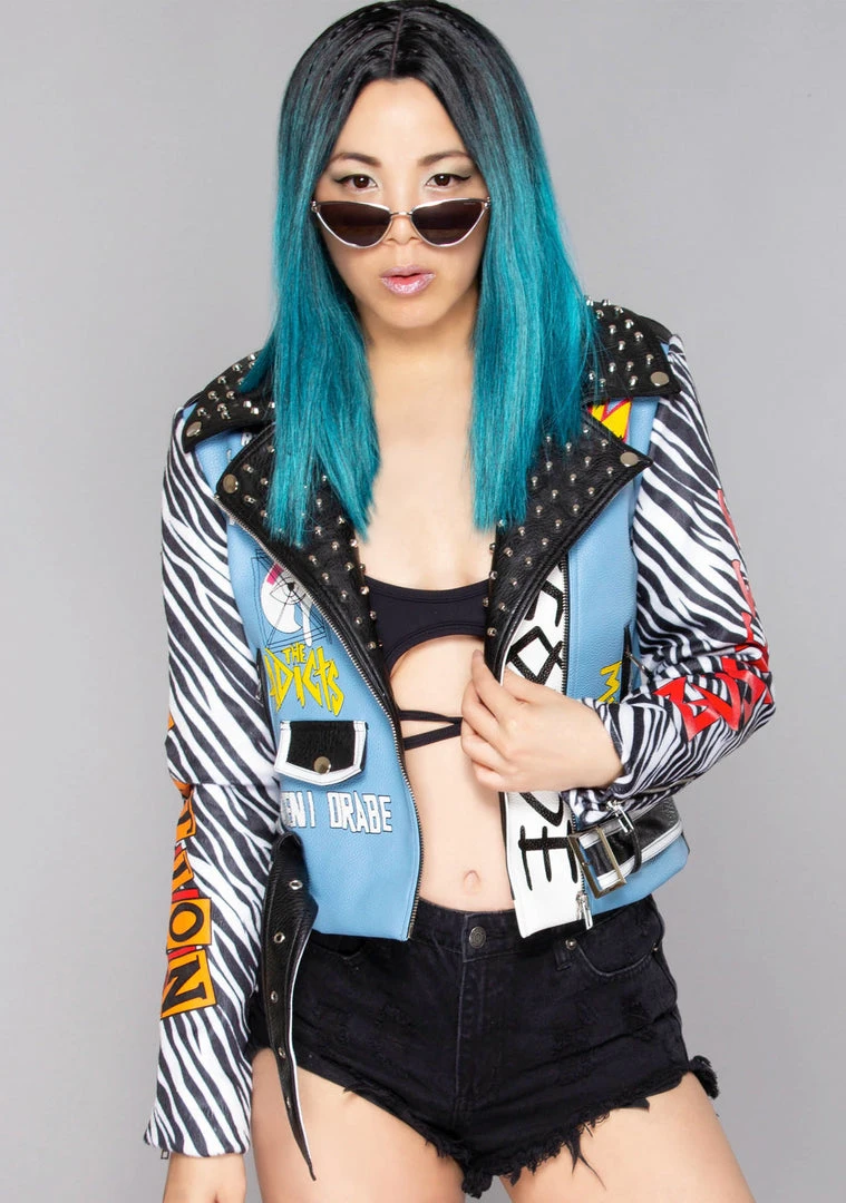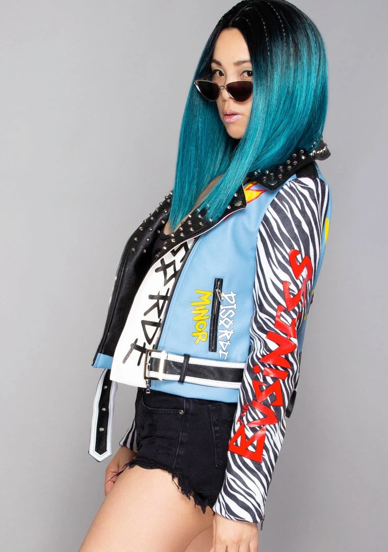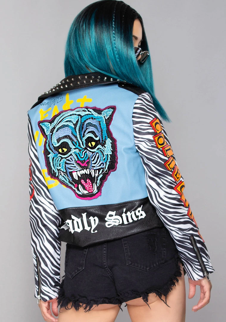 Being bad never looked so good when rocking the Azalea Wang Deadly Sins Moto Jacket. This rad AF festival jackets features vegan leather base with all-over graphic text print patterns, animal printed sleeves, dual front zipper pockets, flathead studs, moto accents, a stitched patch at the back, an optional waist belt, fully lined inner, and zipper closure. Bad chicks rule!