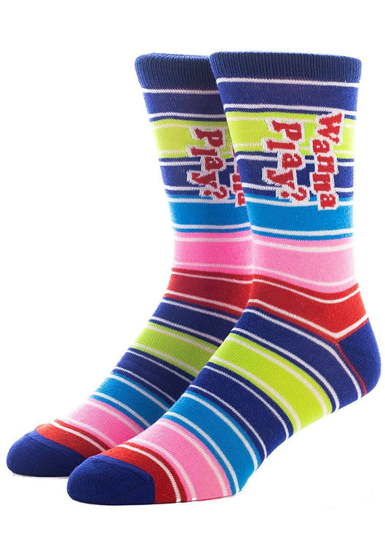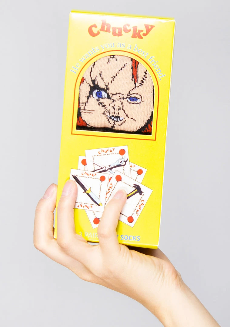 Be your feets friend till the end with the Chucky Best Friend 3 Pack Socks Box Gift Set from Bioworld. This scary cute gift set features three poly-spandex blend party socks with the infamous Chucky packaged in a Good Guys Doll box. Wanna play?