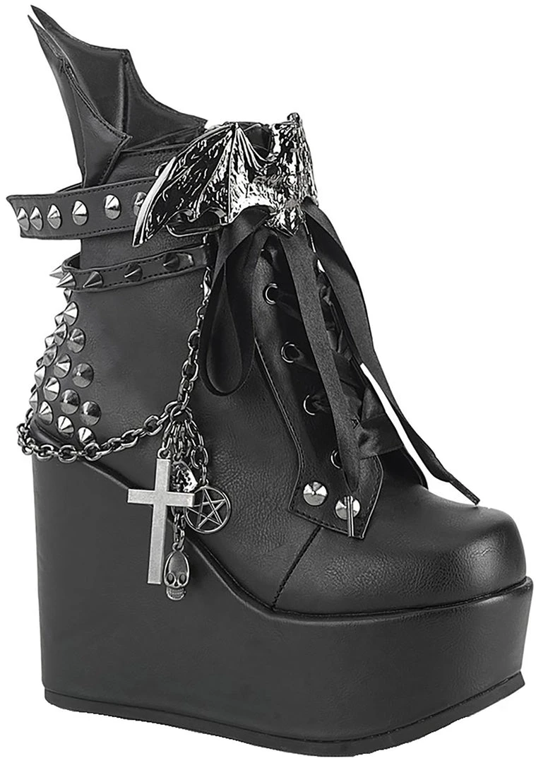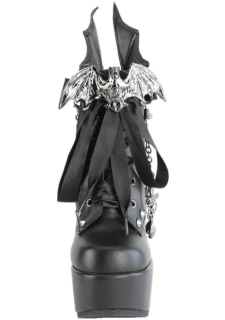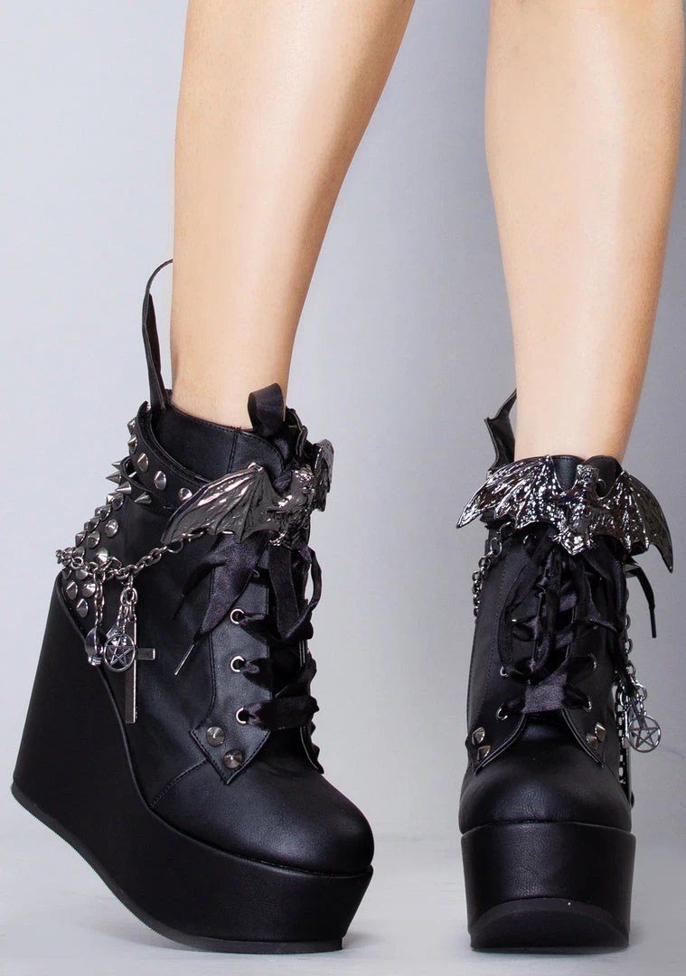 Rule the creatures of the night with the Fang Fatale Platform Heels from Demonia. These sinfully fabulous women’s high heels feature an all-black vegan leather upper with lace-up front, bat ankle cut details, stud and charm accents, appliqué wing ankle embellishments, and interior zipper closure. With these cute heels, it’s going to be a bloody good reign!
