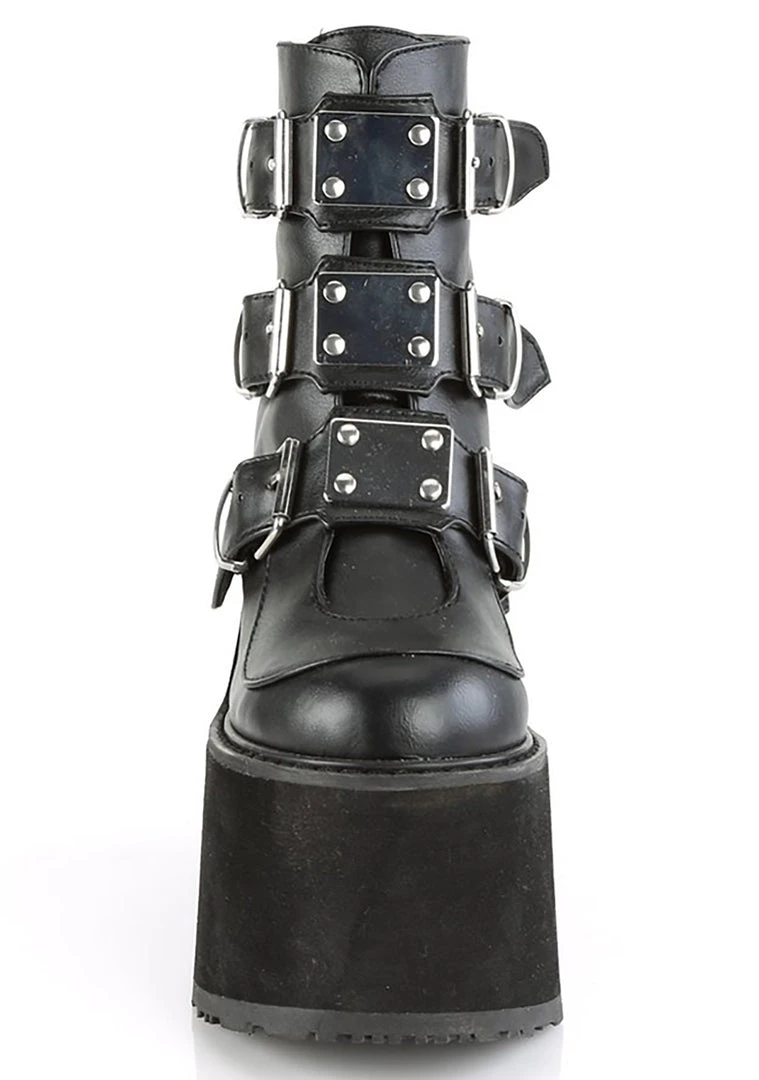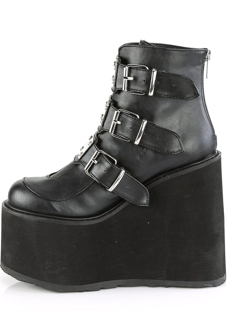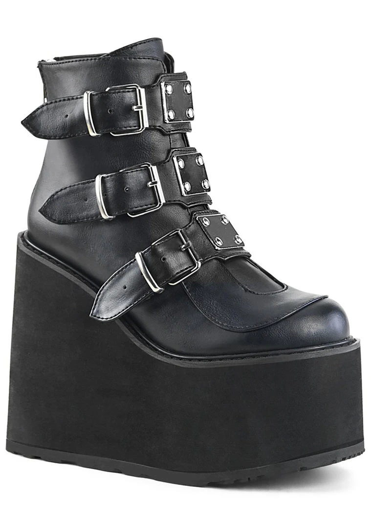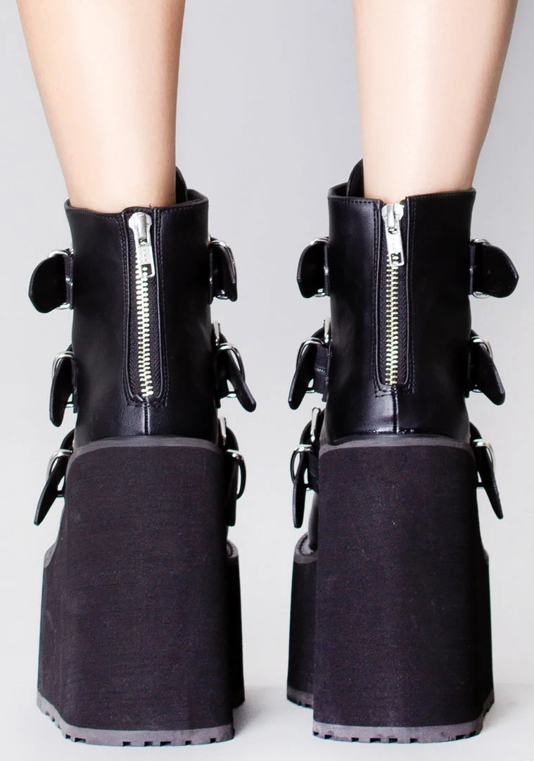 Exit the grid with the Derezzed Platform Boots from Demonia. These bada$$ festival boots feature an all black vegan leather upper, buckle strap up front with metal plate details, EVA foam wedge heel, and zipper closure up the back. Strap these boots on and let the void consume you.