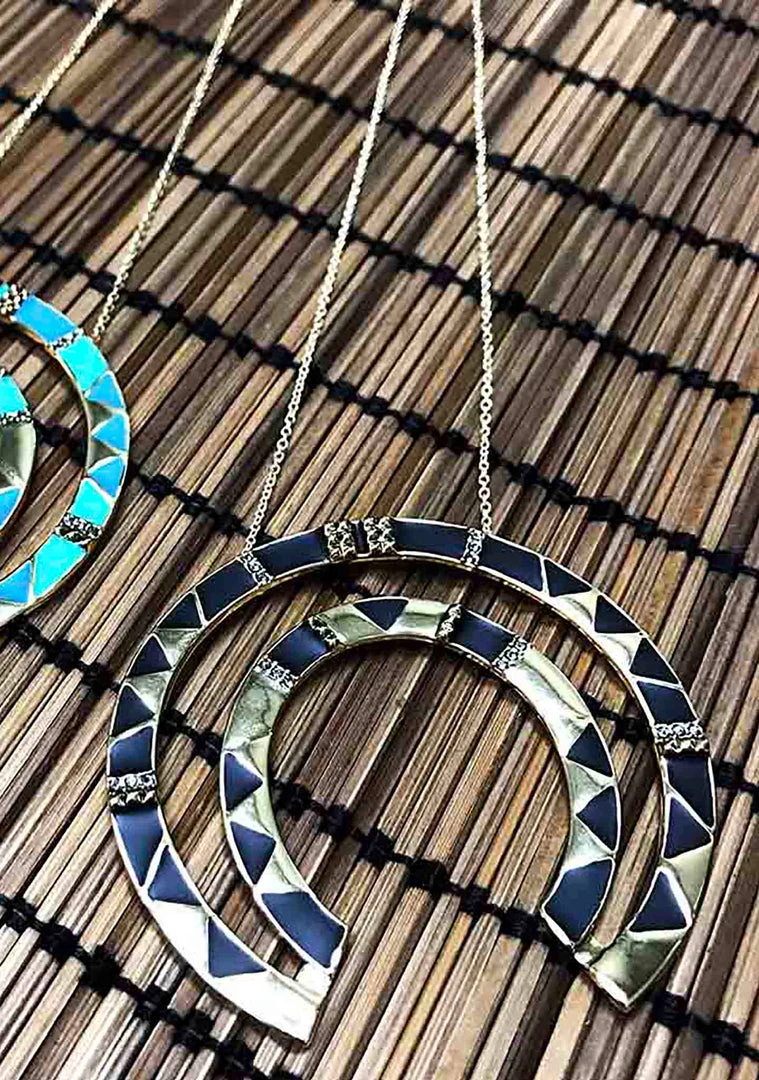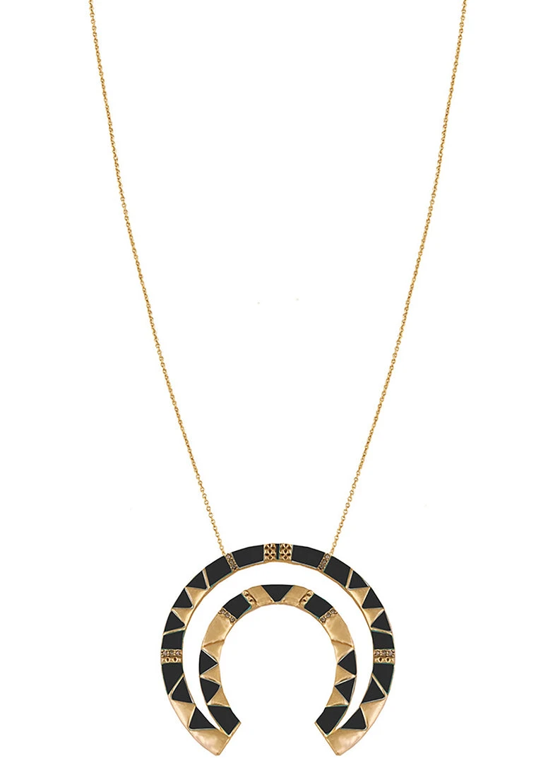 Complete your summer tribal look with these stunning Nelli Pendant necklace from House of Harlow 1960. These summer cool necklaces features an oversized up-side-down U shaped pendant with black enamel tribal pattern detail on long gold chained necklace.