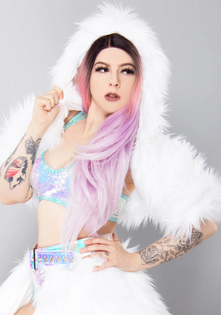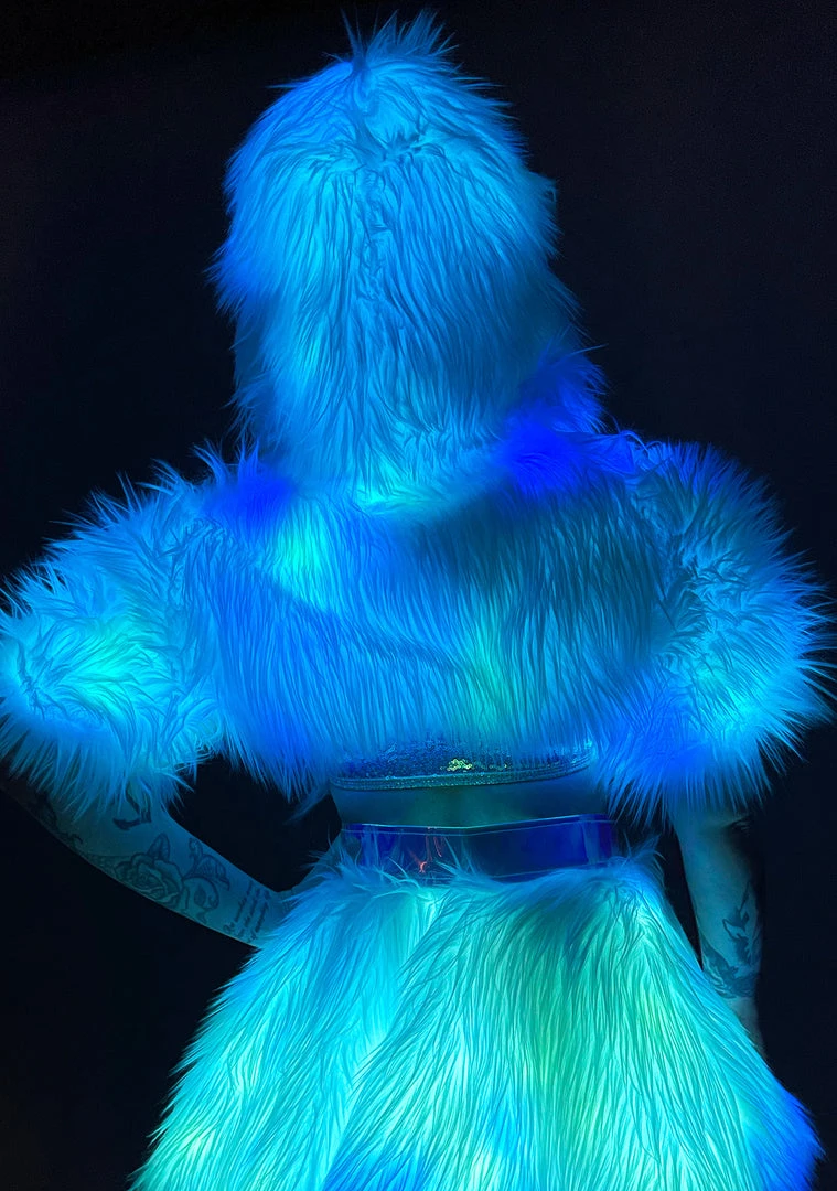 The Mystic Glow Light Up Shrug from J Valentine will have the entire dance floor under your spell. This enchanting festival jacket features an all-white faux fur shrug with built-in green and blue lights and an attached hood. Match this cute top with the Mystic Glow Light Up Belted Skirt and whisk them away to your world!