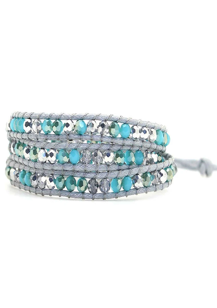 Accessorize your wrist with this beautiful Azalea beaded triple wrap bracelet by LASR X Kate Soleil. This beautiful beaded Wrap Around Bracelet is designed with a variety of glass beads and stone beads secured with cotton cords and finished with signature secure button loop closure. Wrap this bracelet three times around your wrist or stack it up.
