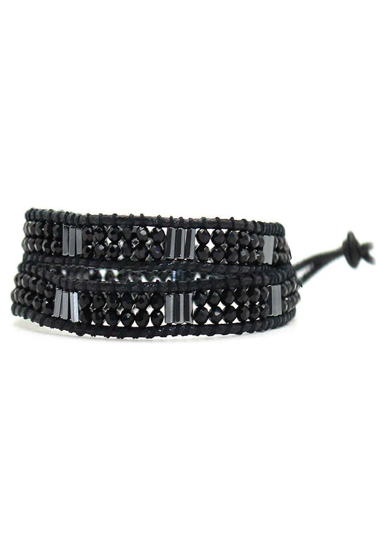 Accessorize your wrist with this beautiful Melody Double Wrap beaded bracelet by LASRÂ X Kate Soleil. This beautiful beaded Wrap Around Bracelet is designed with a variety of glass beads and stone beads secured with cotton cords and finished with signature secure button loop closure. Wrap this bracelet twice around your wrist or stack it up.
