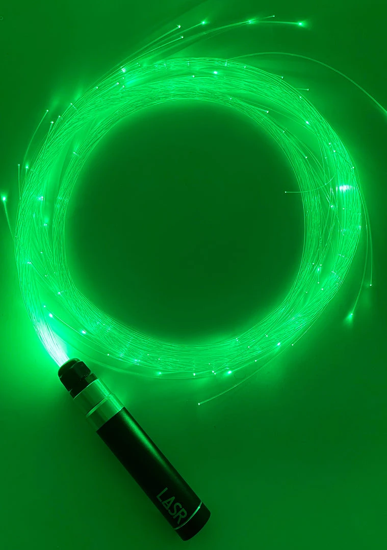 You ready for a wild ride?! Let’s speed things up with the Nitro Velocity Fiber Optic Light Up Whip from LASR. These swift rave accessories feature a sleek black handle with an on/off switch, green LED lights, and multiple fiber optic strands. Go on tell ’em better not blink or they’ll miss you.