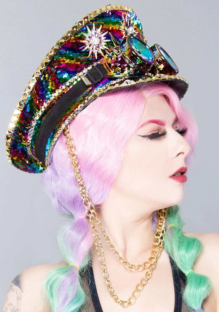 You are the ultimate #DIVA with the Primadonna Sequin Captain Hat from LASR. These totally hot festival hats feature a full-on rainbow sequin captain style hat with a gem-encrusted front, chain and stud trimmings, removable kaleidoscopic spike goggles, and an elastic chin strap to keep that hat on while you’re partying til’ the sun comes up. With this cute hat, you’ll be the star of the show.