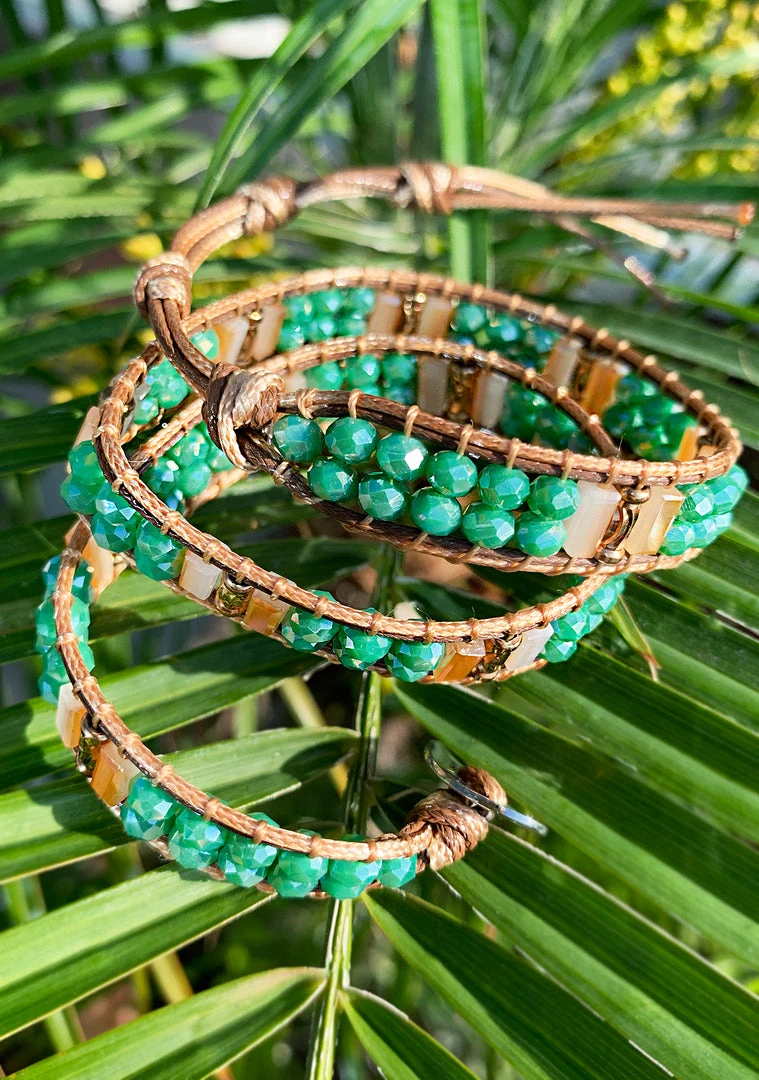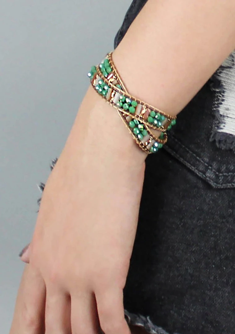 Take and festival look to the next level with this beautiful Lexington Beaded Double Wrap bracelet. This stunning beaded Wrap Around Bracelet is made with a blend of high quality threads, cotton cord, synthetic beads and secure loop closure. This bracelet is long enough for you to wrap around your wrist up to two times creating a cuff like look.