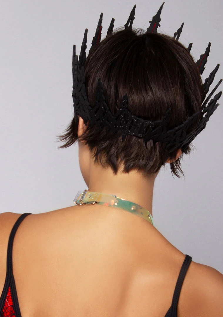 You’re pure wicked royalty in the Scream Queen Glitter Crown. This fiendish festival hair accessory features a black glitter base, die-cut design elements and arresting ruby toned embellishments. This regal costume crown will have them bowing down to you.