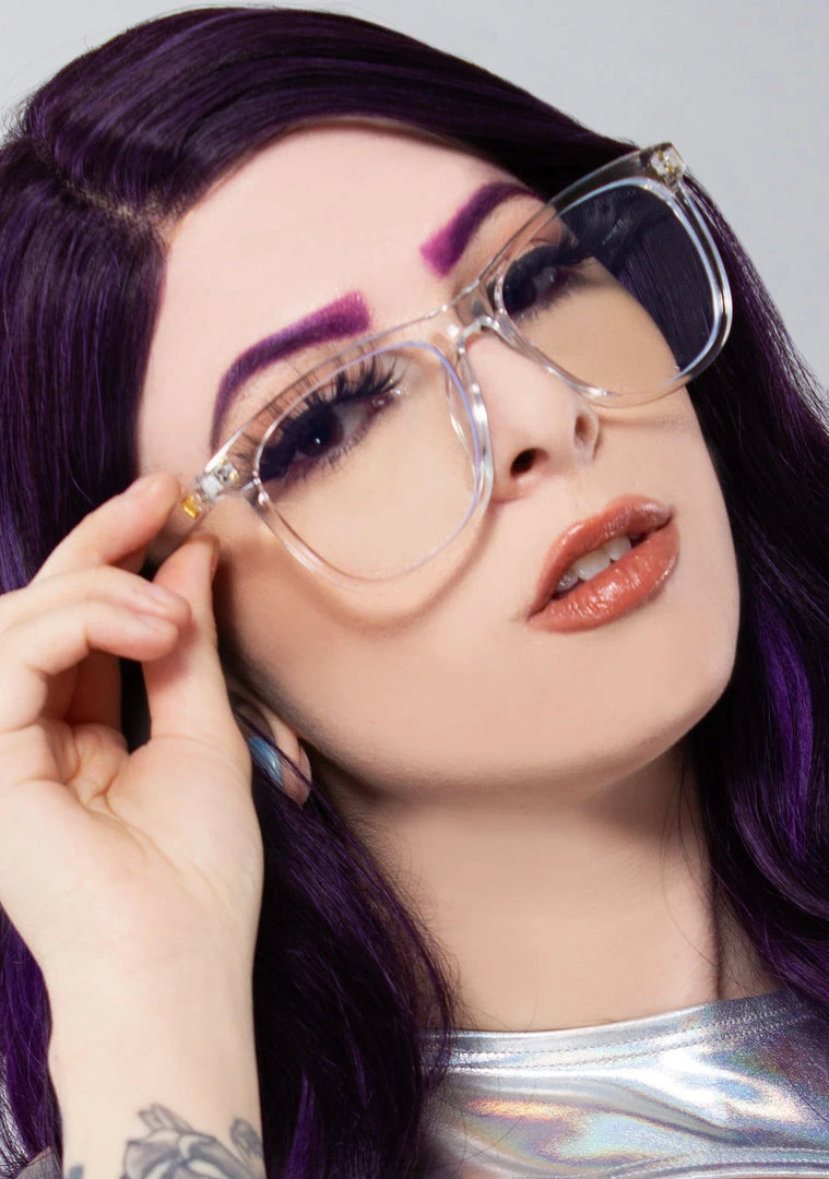 Protect your eyes in style with the Audrey Anti-Blue Light Glasses from Topfoxx. These ultra cute rave glasses feature a classic clear frame, non-prescription blue light blocking lenses, and classic Topfoxx icon on the stems. Staying safe never looked so good.