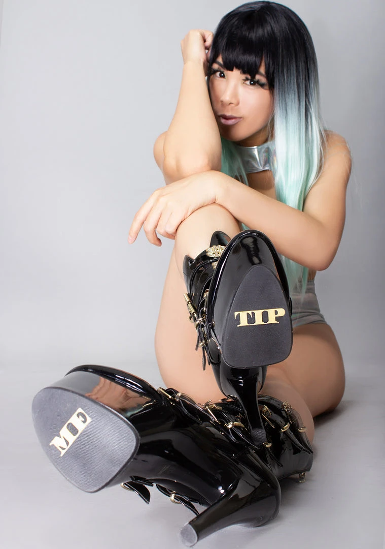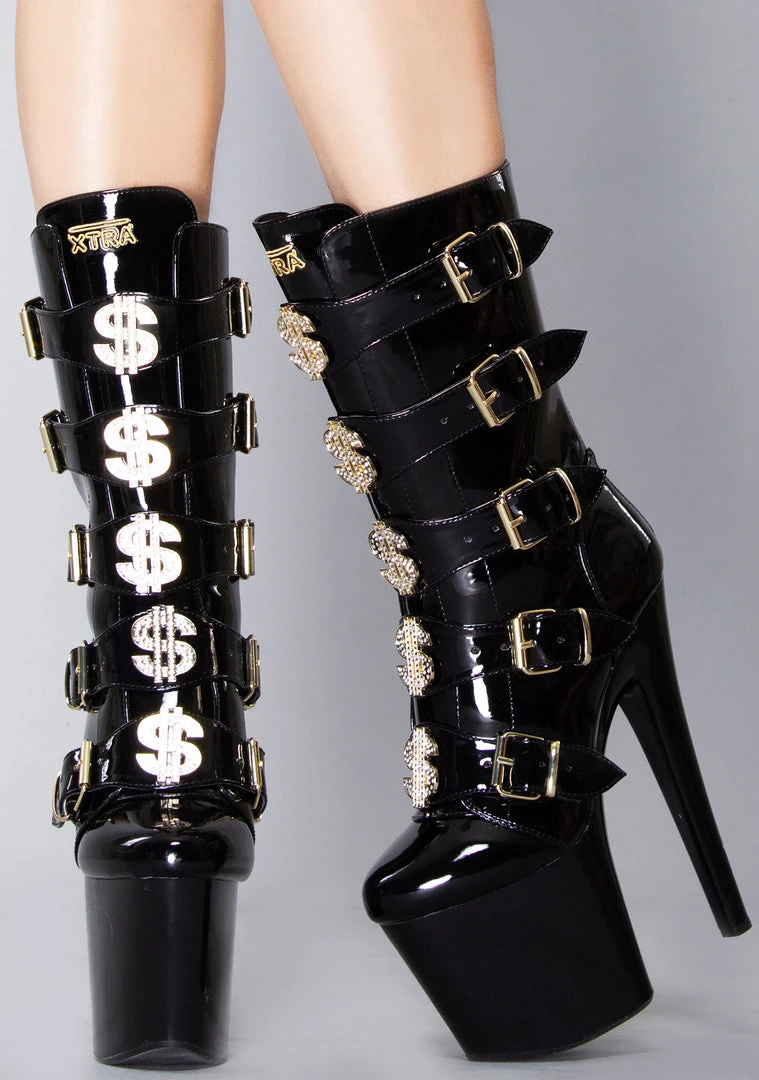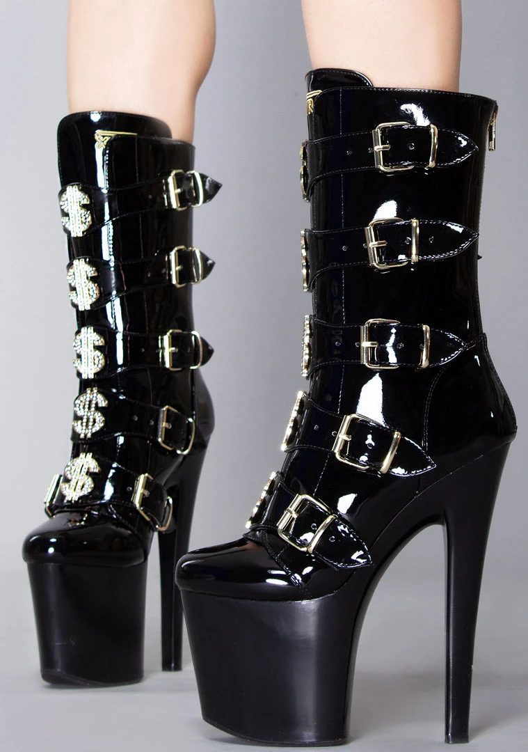 They’ll make it rain when you wear the VIP Platform Heel in Black Gold from YRU! These totally hot platform heels feature an all-black vegan patent leather outer, 5 buckled straps up the front with gold-tone hardware, blinged our enamel dollar sign details, sky-high platform heel, zipper closure up the back, and ‘Tip Me’ printed rubber outsole. With these cute boots, they’ll be wanting you in a room all to themselves.