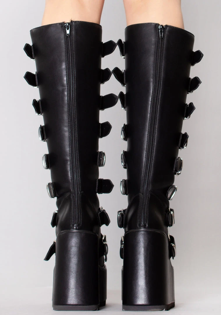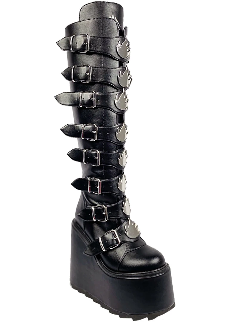 Make your outfit hotter than hell with the Dune Hi Flame Platform Boots from YRU. These bada$$ festival boots feature an all-black vegan leather upper, buckle upfront with enamel flame detail, and zipper closure up the back. These boots are almost too hot to handle.