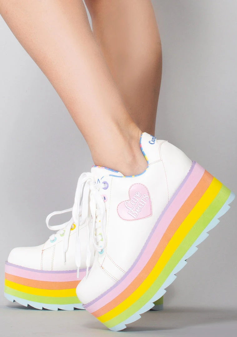 Enter a land of love magic and rainbows while wearing the Care Bears Lala Platform Sneakers in White Pastel from YRU. These magical platform sneakers feature a multicolor vegan leather upper, lace-up front, applique detail, and colored bottom. #CaringIsWhatCounts