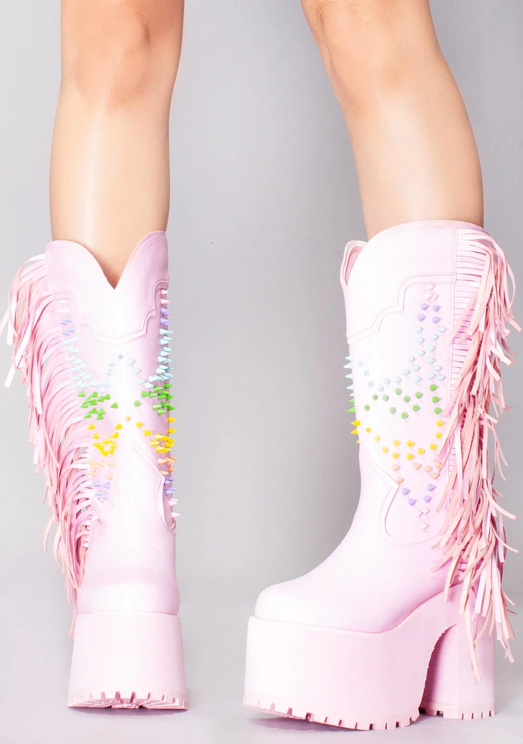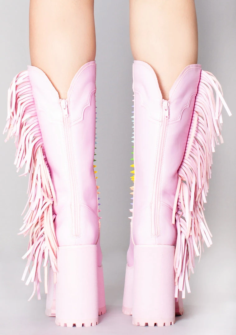 Ditch the rhinestones and be a rock n’ roll cowgirl with the Bad B Fringe Platform Boots from YRU. These awesome festival boots feature an all pink vegan leather upper and wrapped sole, rainbow spike details, fringe accents along the exterior, and zipper closure up the back. These cute boots will have you partying like a rockstar and kicking a little a$$!